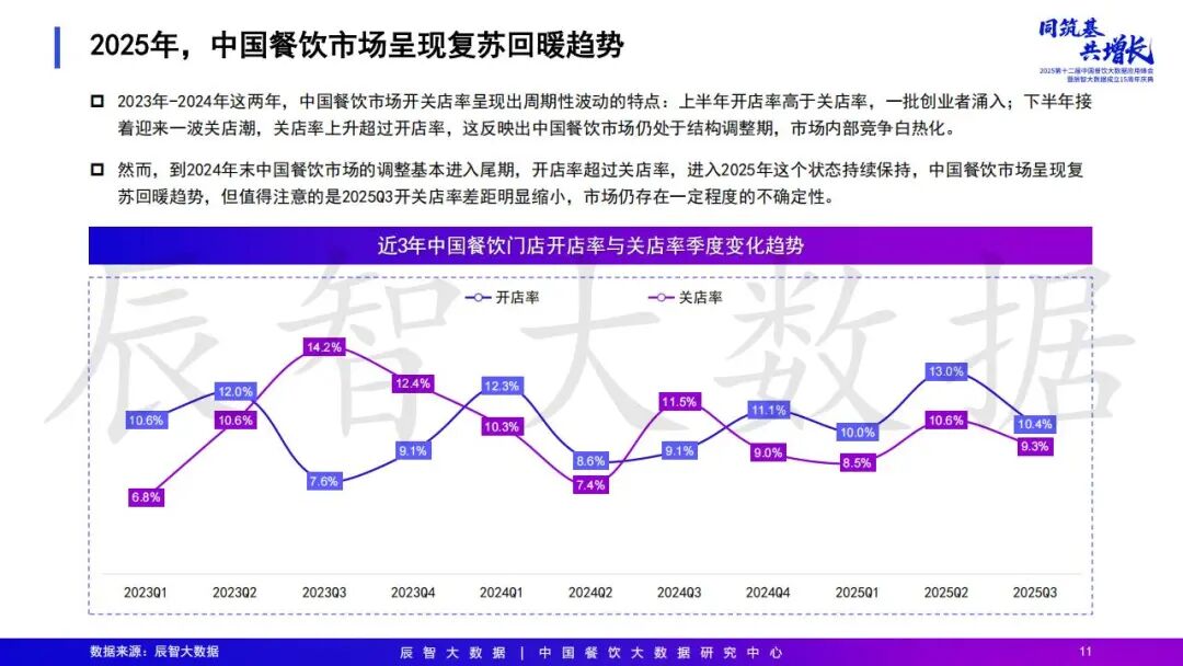 从开关店率来看,2025年Q3,开店率10.4%,关店率9.3%,也说明整个餐饮市场正在呈现复苏回暖的趋势。不过开关店率差距明显缩小,市场仍存在一定程度的不确定性。